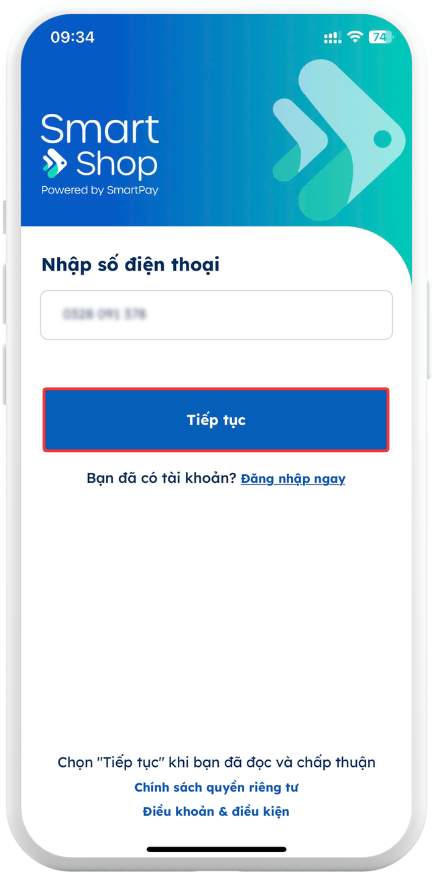 Nhập chính xác số điện thoại và nhấn "Tiếp tục"