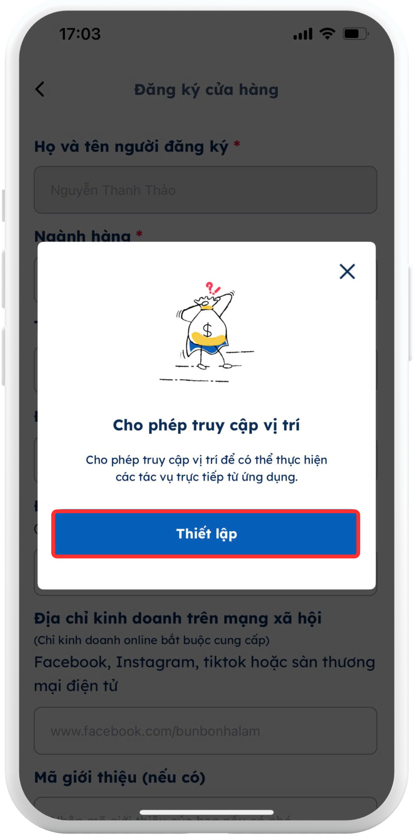 Nhấn "Thiết lập" để cho phép truy cập vị trí