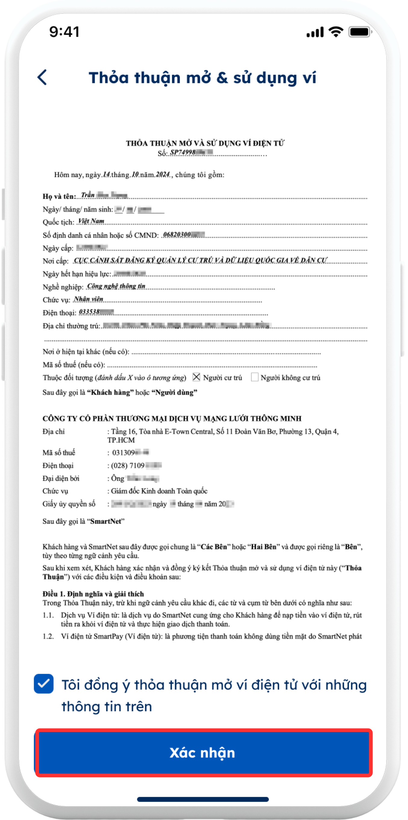 Đọc và "Xác nhận" Thỏa thuận mở & sử dụng Ví