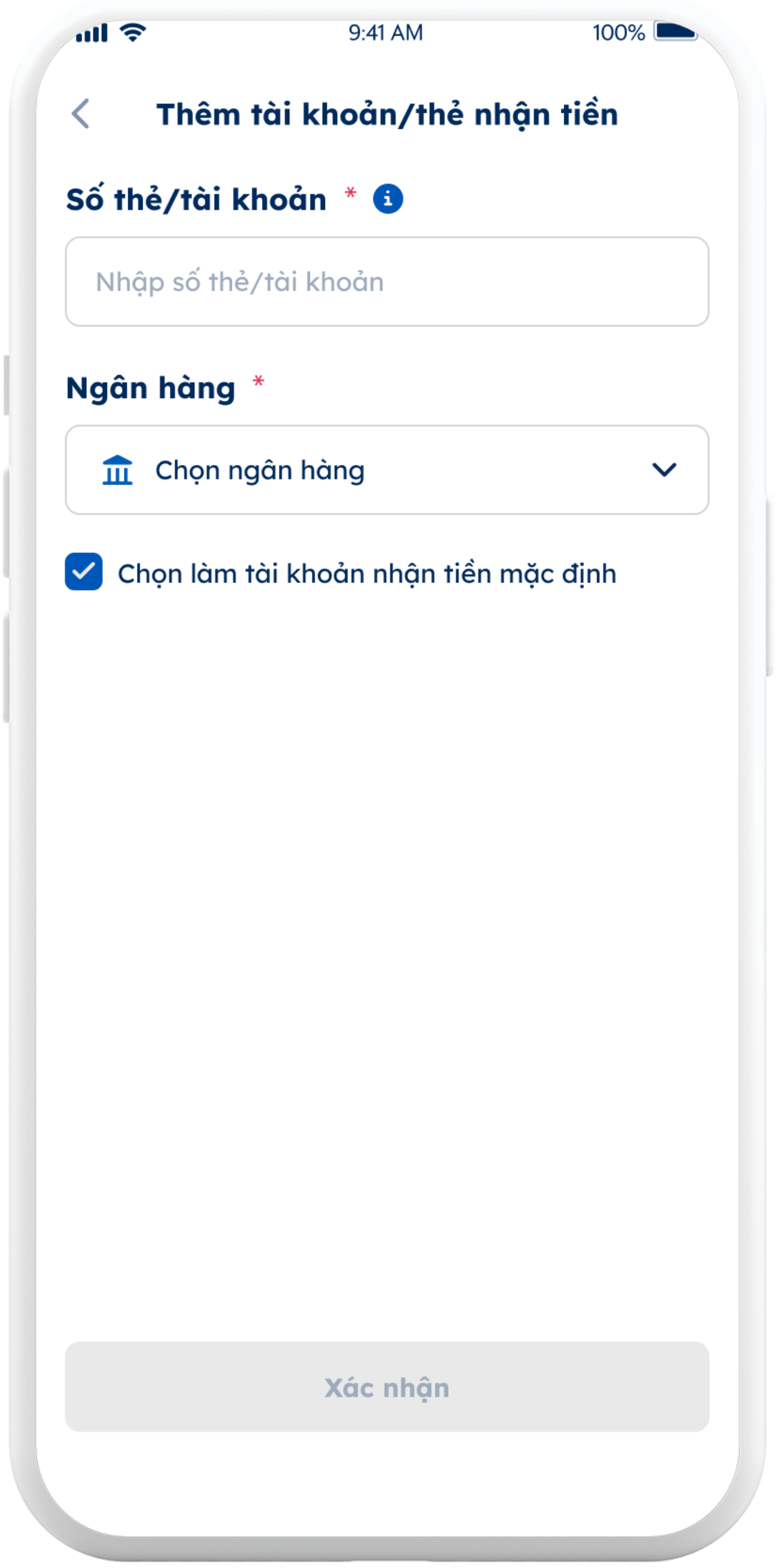 Điền thông tin số thẻ/ tài khoản ngân hàng và xác thực