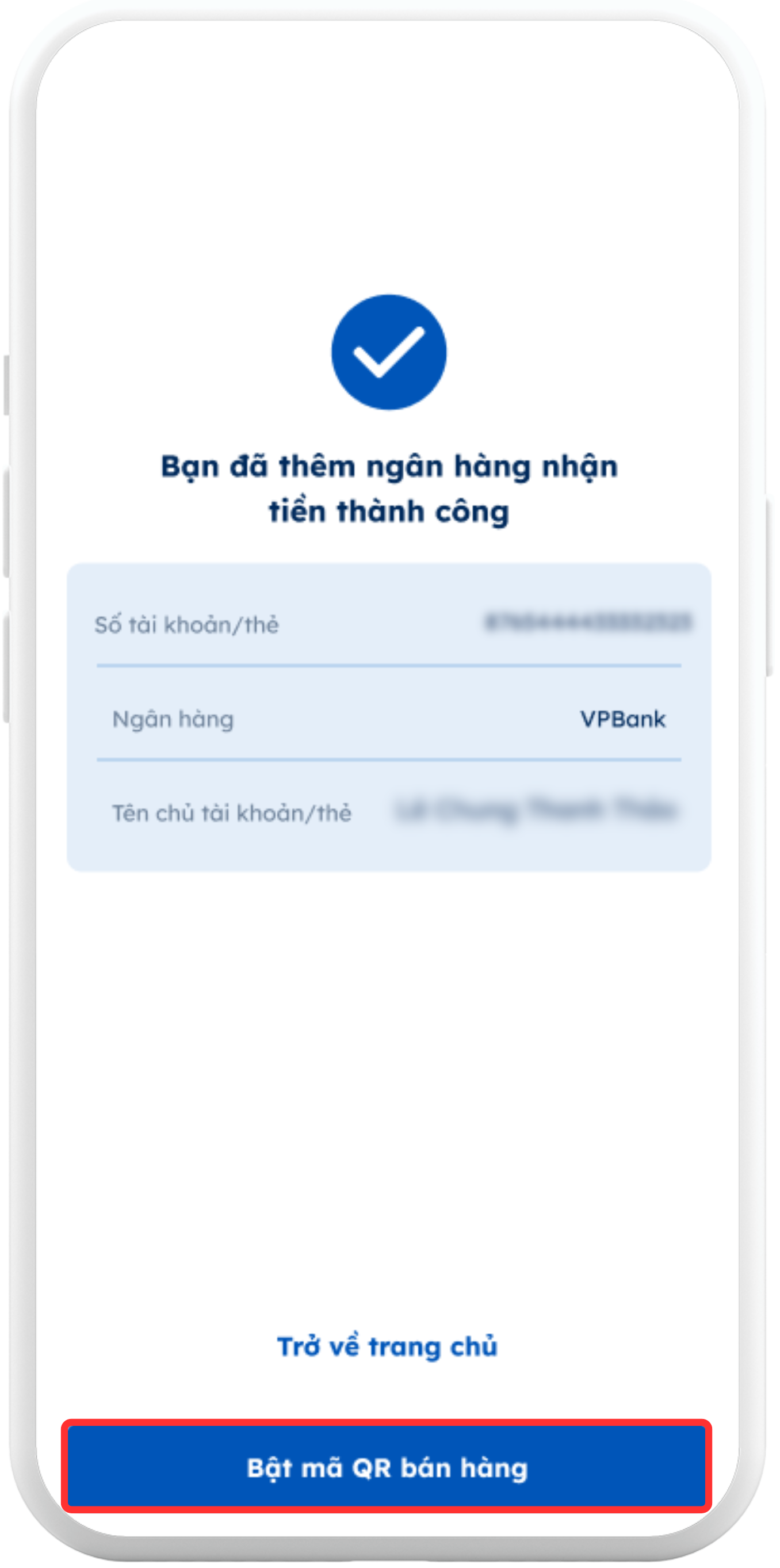 Thông báo đăng ký tài khoản ngân hàng nhận tiền thành công